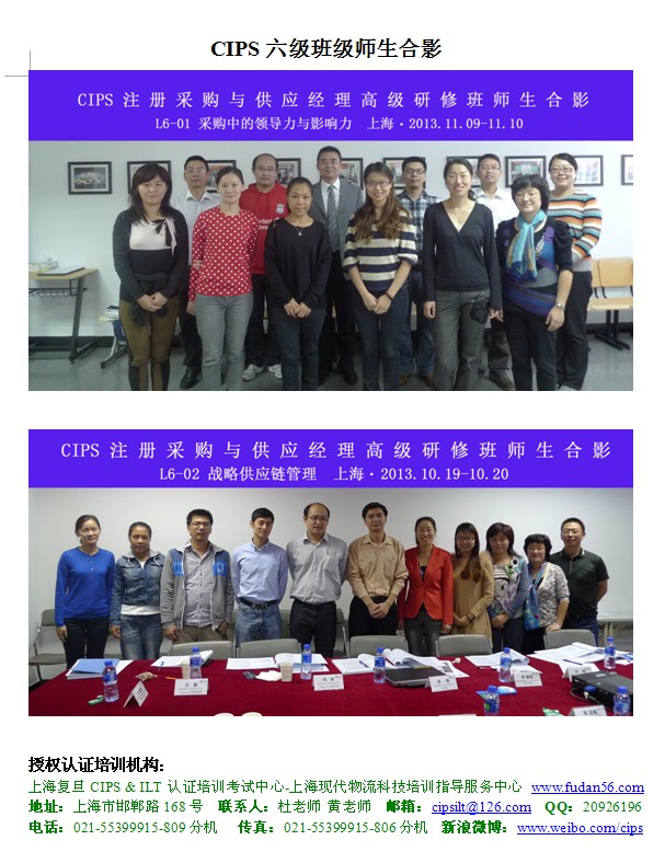 2013年11月10日,CIPS上海复旦认证培训考试中心暨上海现代物流科技培训指导服务中心针对2013年11月CIPS全球认证考试的四、五、六级课程培训顺利落下帷幕,来自上海及长三角周边地区的近70多家企业,合计近90人次(CIPS四级61人次,CIPS五级15人次,CIPS六级13人次)的采购经理和采购专员、市场经理、总经理等人员加了本期课程的培训。我中心自2009年全国首开CIPS五级课程以来,连续三期(2012下、2013上、2013下)全国独家首开了CIPS六级课程。